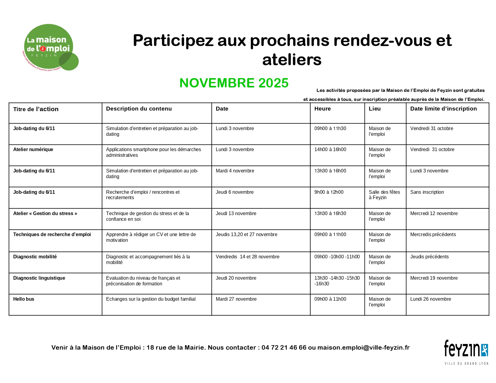 La Maison de l'Emploi organise des rendez-vous et ateliers pratiques pour accompagner les Feyzinois dans leur recherche d'emploi, de formation ou de reconversion professionnelle. Découvrez les rendez-vous programmés pour le mois de novembre dans cet article.