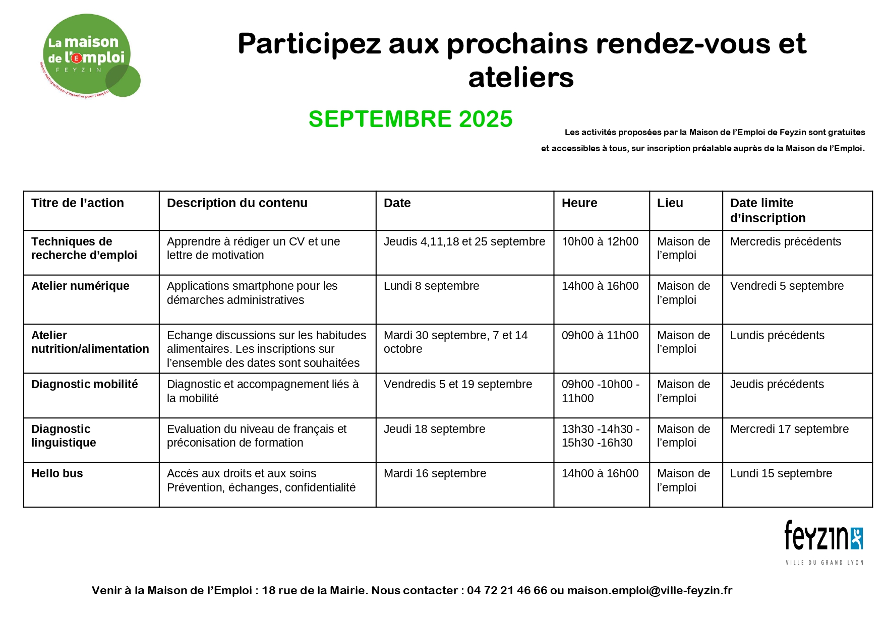 Contacter la Maison de l'Emploi : 04 72 21 46 66 ou maison.emploi@ville-feyzin.fr